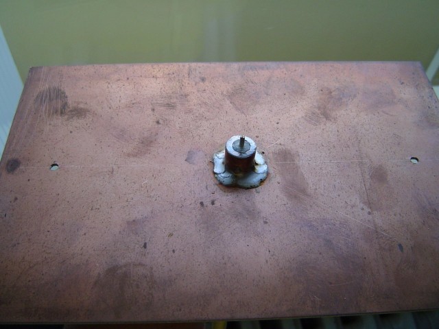 Une fois que tout cela est prêt, il ne reste plus qu’à percer le reflecteur, y glisser le tube et souder. La distance entre le quad et le reflecteur doit être comprise entre 15 et 17mn (Lambda/10 d’après Xavier, mais surtout pas Lambda/4 comme on peut lire) . Attention, néanmoins prévoir un fer soudé d’au moins 80Watts, car sinon il est impossible de souder le tube.