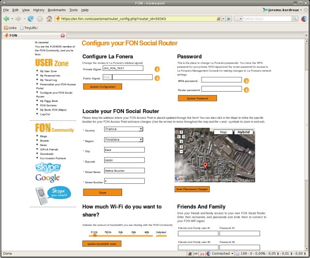 On branche, le tout .. le Fonera obtient une adresse IP via DHCP sur le lien filaire, par contre on ne peut y accéder que via l’interface WIFI. Dans un second temps, dès que l’on essaye de surfer on abouti sur une page de login. Il suffit de s’identifier avec le login / password obtenu lors de l’achat du Fonera. (Note, en fait peu importe le login utilisé, il sera utilisé comme propriétaire du dit Fonera.. je dis cela pour ceux qui ne l’on pas acheté)..