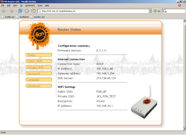 Pour commencer, connectez vous au reseau wifi MyPlace. La Fonera a pour IP : 192.168.10.1 (Acces SSH, user: root , password: admin)