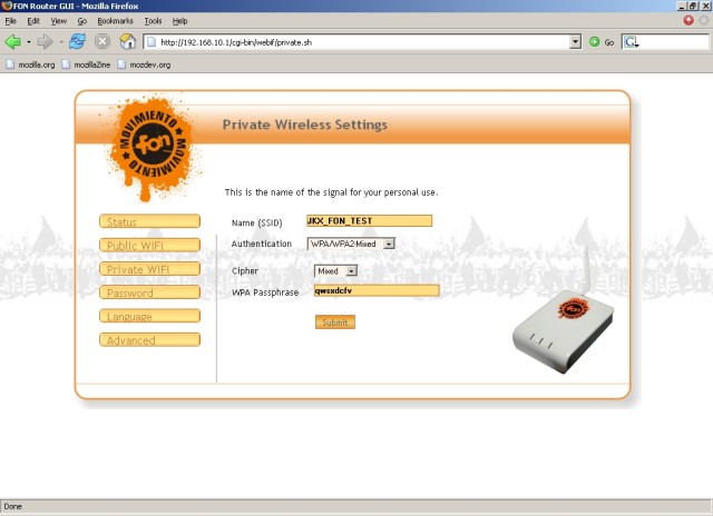 Comme vous pouvez le voir, ce routeur permet d’avoir deux réseaux WIFI séparés. Un pour FON (”FON_AP”) et un autre privé utilisant du WPA (”JKX_FON_TEST”).