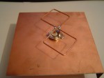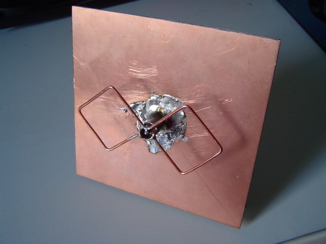Une fois que tout cela est prêt, il ne reste plus qu’à percer le reflecteur, y glisser le tube et souder. La distance entre le quad et le reflecteur doit être comprise entre 15 et 17mn (Lambda/10 d’après Xavier, mais surtout pas Lambda/4 comme on peut lire) . Attention, néanmoins prévoir un fer soudé d’au moins 80Watts, car sinon il est impossible de souder le tube.
